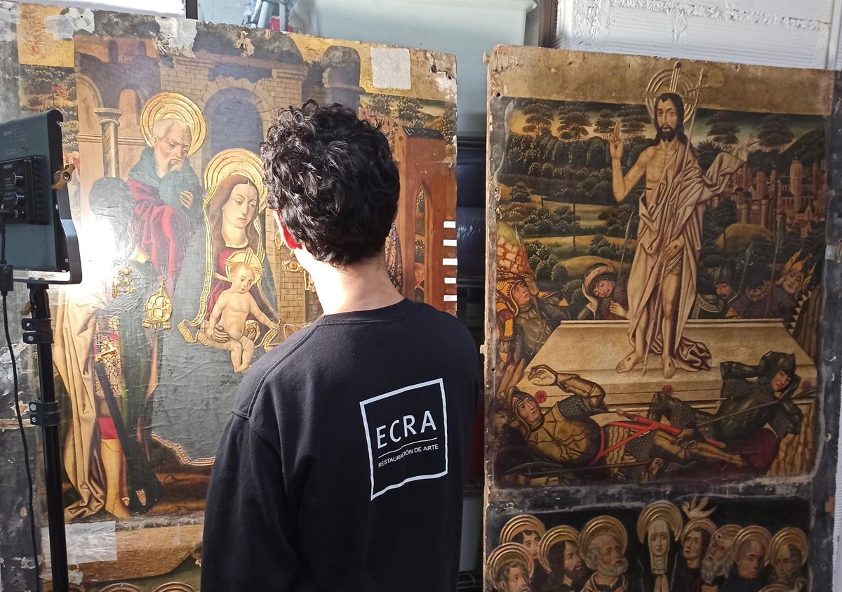 El retablo se encontraba dividido en 24 piezas embaladas, que han sido trasladadas hasta el taller que la empresa restauradora tiene en Madrid. Los trabajos se centran en la desinfección de la madera, consolidar los materiales, adherir, limpiar, eliminar barnices, rellenar lagunas y reintegrar los cromas para recuperar el color de la obra.
