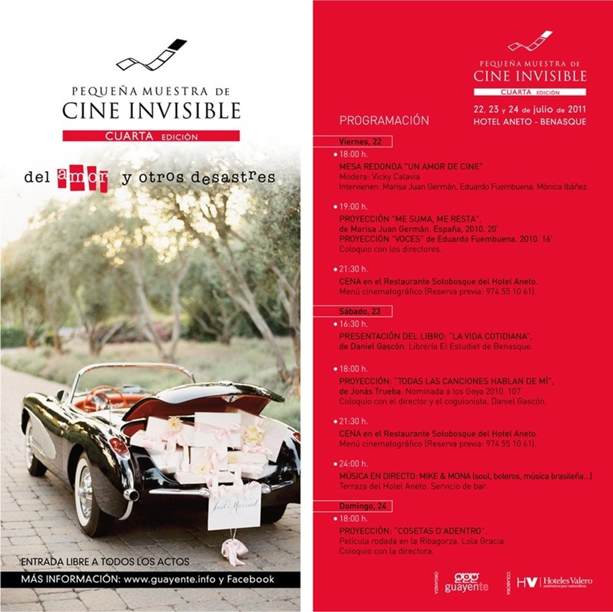 Un año más se celebra la cuarta edición de la 'Pequeña Muestra de Cine Invisible', que tendrá lugar en Benasque durante los días 22, 23 y 24 de julio, en el Hotel Aneto, un evento organizado por la Asociación Guayente. En esta ocasión, la temática lleva el título 'Del amor y otros desastres'.