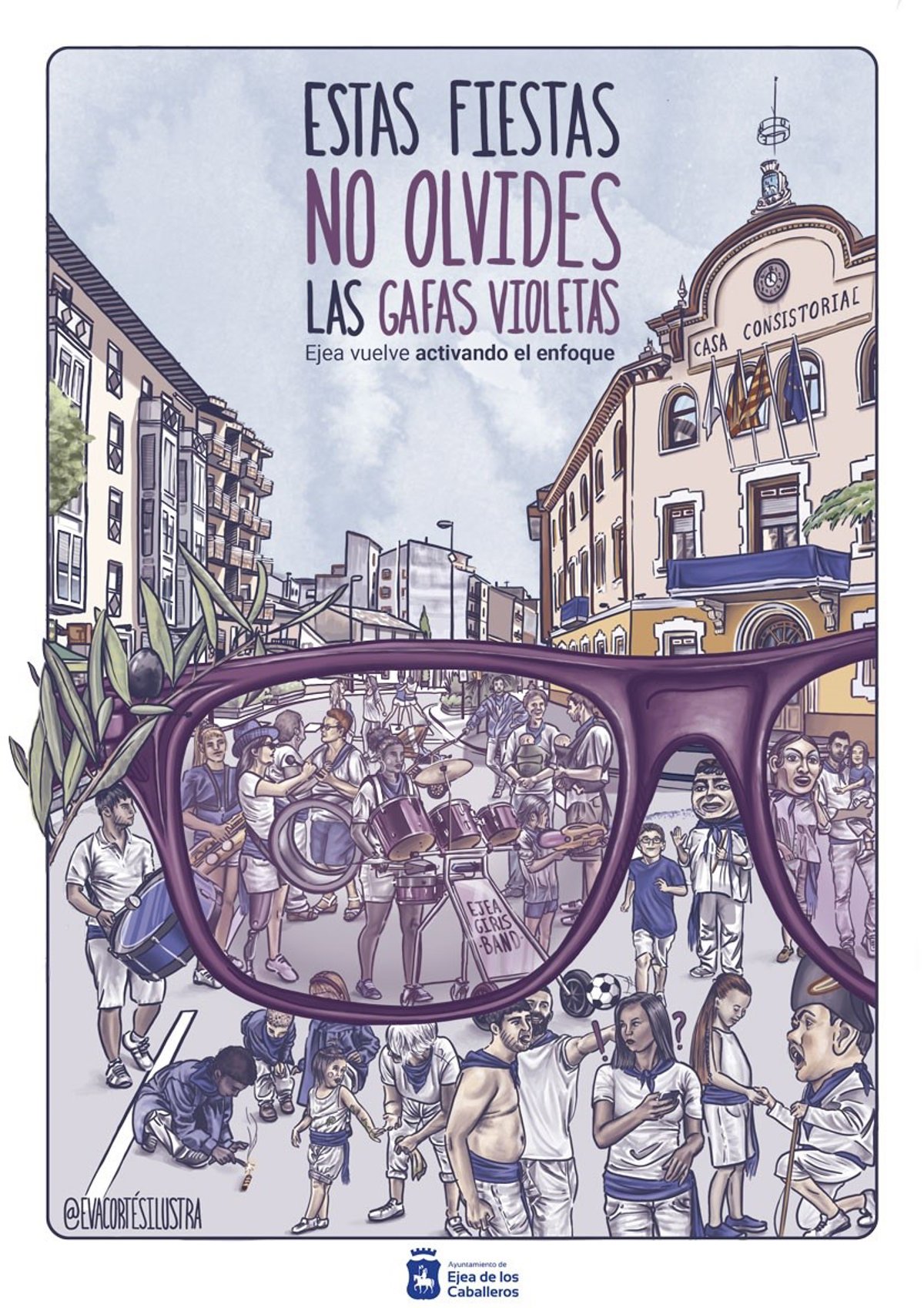 El municipio zaragozano de Ejea de los Caballeros va a acoger una campaña de igualdad durante las fiestas patronales de este año, que se celebrarán del 27 de agosto al 4 de septiembre. Bajo el lema 'Activa el enfoque', esta iniciativa incluye el diseño de un cartel, a cargo de la ilustradora Eva Cortés, que plasma un momento de estas celebraciones, junto al Consistorio, lugar donde dan comienzo, y unas grandes gafas violetas.