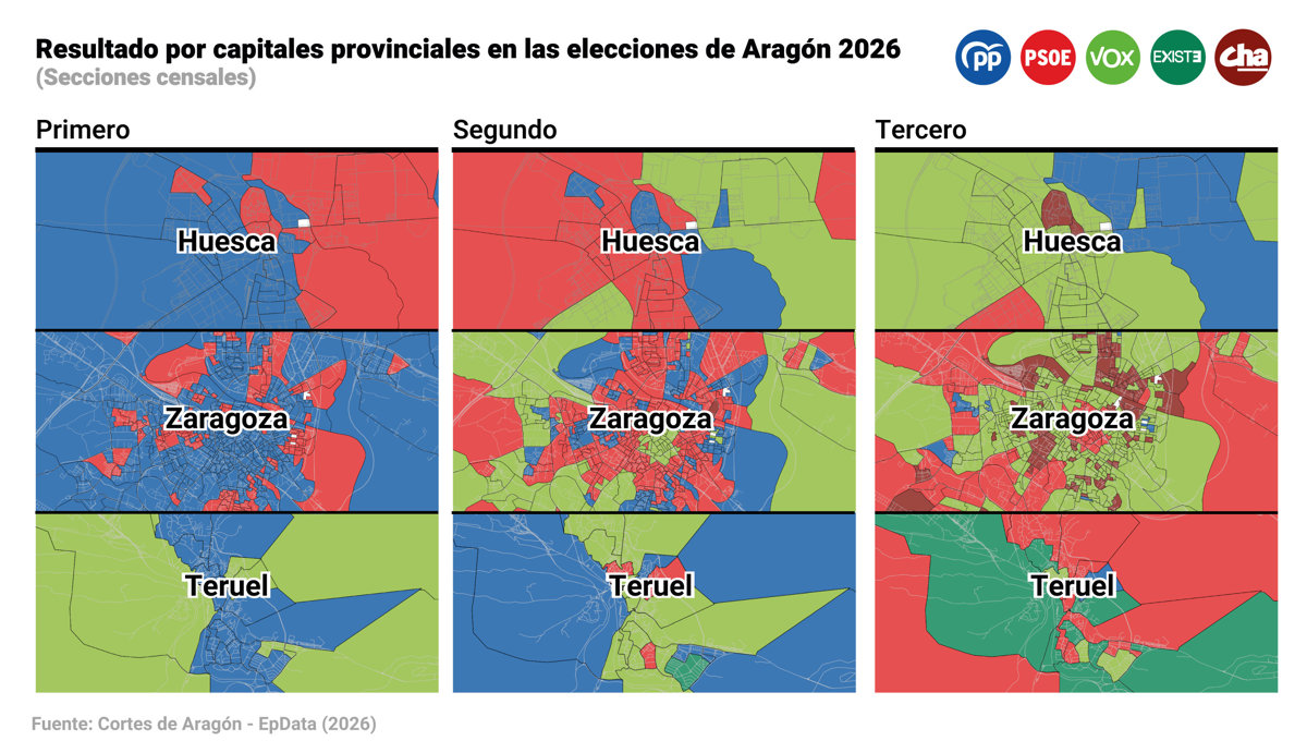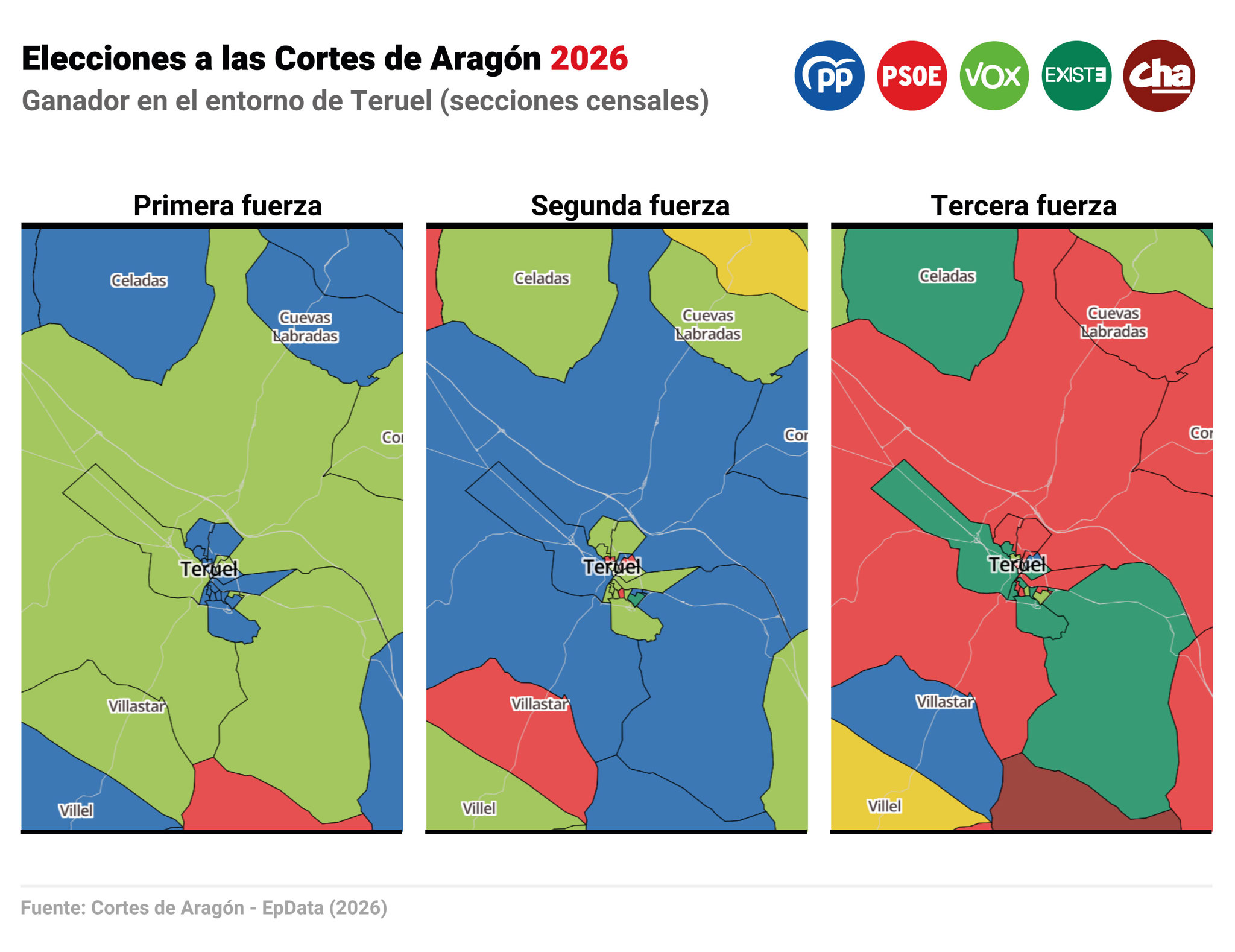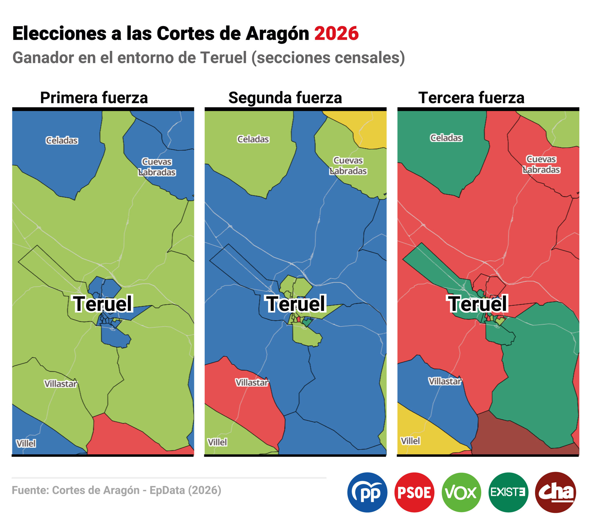 Vox se convirtió en segunda fuerza en la ciudad de Teruel, protagonizando un 'sorpasso' tanto al PSOE como a Teruel Existe, que había ocupado esa posición en los anteriores comicios. La formación pasó de ser cuarta en 2023 a segunda en 2026 en la capital turolense. En este enlace puedes ver detallados los resultados calle a calle.