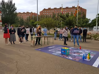 Para la iniciativa de hoy se ha preparado al efecto un tablero de lona de unos nueve metros cuadrados, con fichas de gran tamaño, con los que los jóvenes han podido participar de forma activa.
