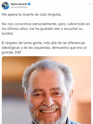 "Me apena la muerte de Julio Anguita. No nos conocimos personalmente, pero, sobre todo en los últimos años, me ha gustado leer y escuchar su lucidez. El respeto de tanta gente, más allá de las diferencias ideológicas y de las izquierdas, demuestra que era un grande. DEP", ha publicado Escartín en un 'tuit' en su cuenta de la red social.