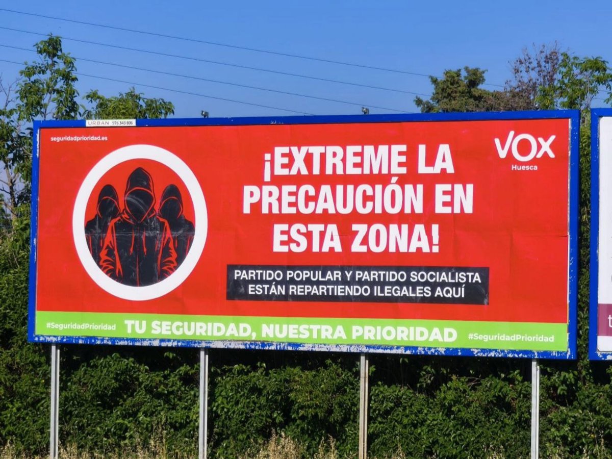 La formación liderada por Santiago Abascal instaló un cartel publicitario a la entrada de la capital altoaragonesa en la que se puede leer '¡Extreme la precaución en esta zona! Partido Popular y Partido Socialista están repartiendo ilegales aquí. Tu seguridad, nuestra prioridad'.