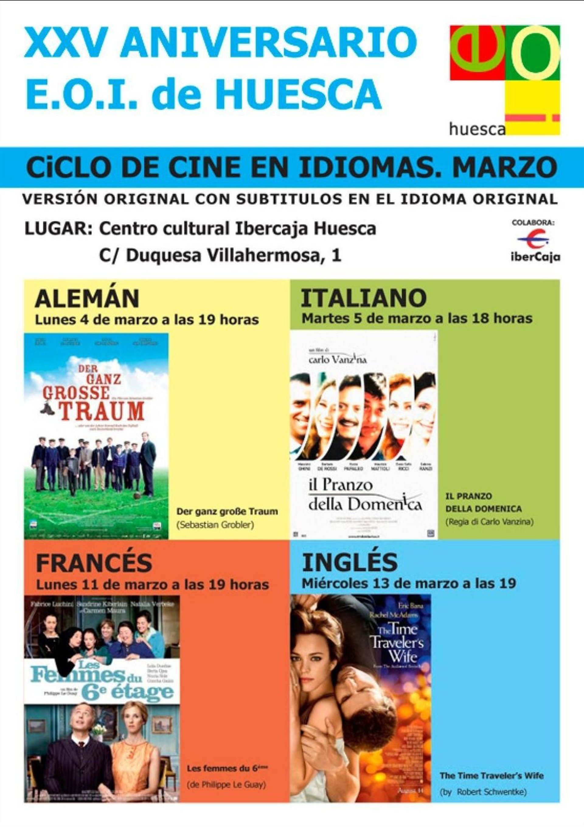 El ciclo se va a desarrollar en el centro Ibercaja Huesca y es de entrada libre. Comenzará este lunes, día 4 de marzo, con la película en alemán 'Der ganz groBe Traum', de Sebastian Grobler, a las 19.00 horas. El martes 5, a las 18.00 horas, será turno del italiano con 'Il pranzo della domenica', de Regia di Carlo Vanzina.