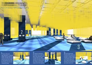 El proyecto del stand presentado por la Escuela de Diseño de Aragón está organizado en tres partes. La primera de ellas corresponde al punto de información y se caracteriza por usar dos grandes lonas a modo de señalización. La segunda está reservada para la zona de ordenadores y la tercera es el área de espectáculos. Este último espacio está pensado para la interactividad con el conferenciante.