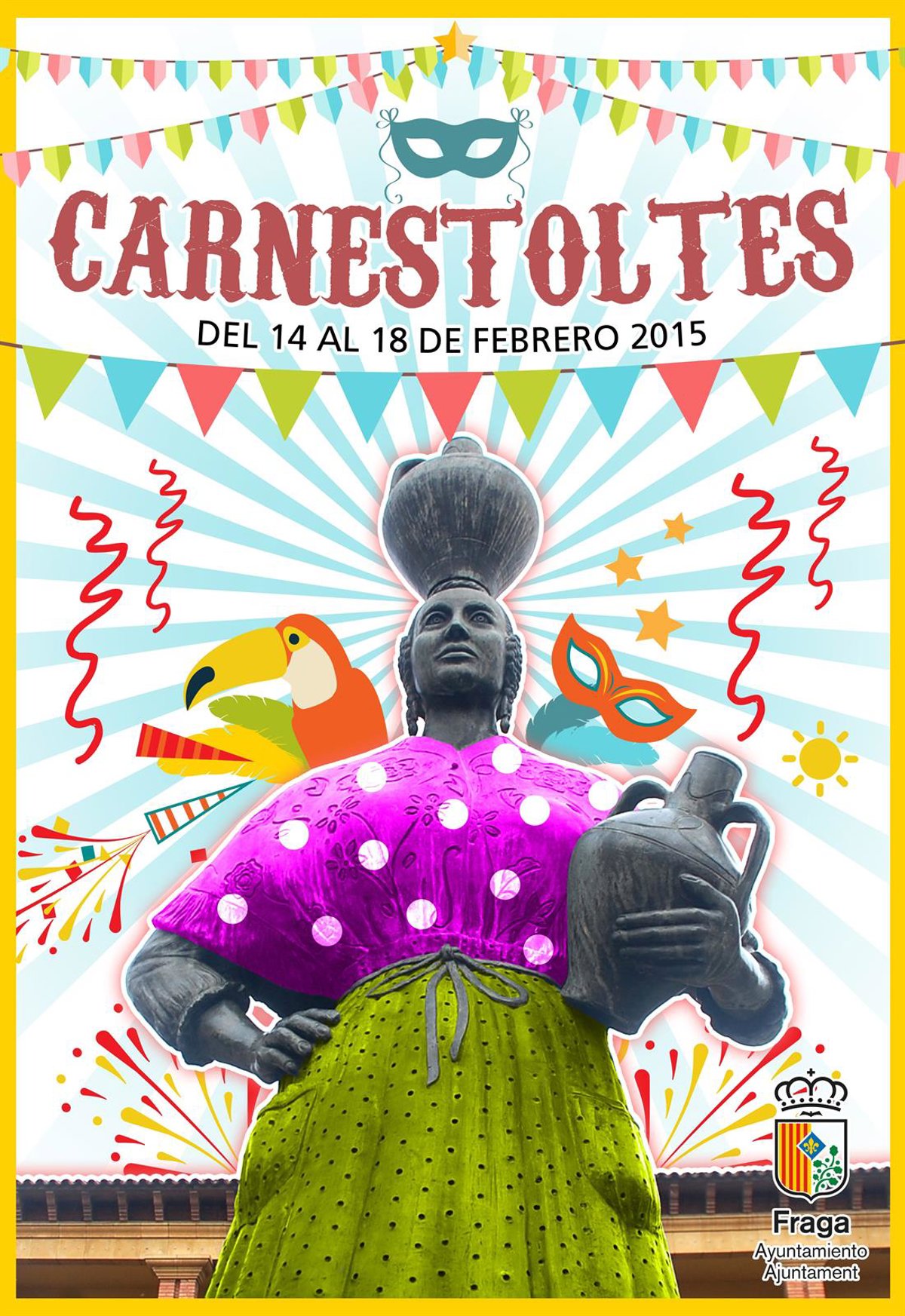 La Fragatina, la escultura de José Arellano que desde los primeros 80 rinde homenaje a la mujer fragatina en la Plaza de España de capital del Bajo Cinca, es la protagonista en 2015 del cartel anunciador de los Carnavales.