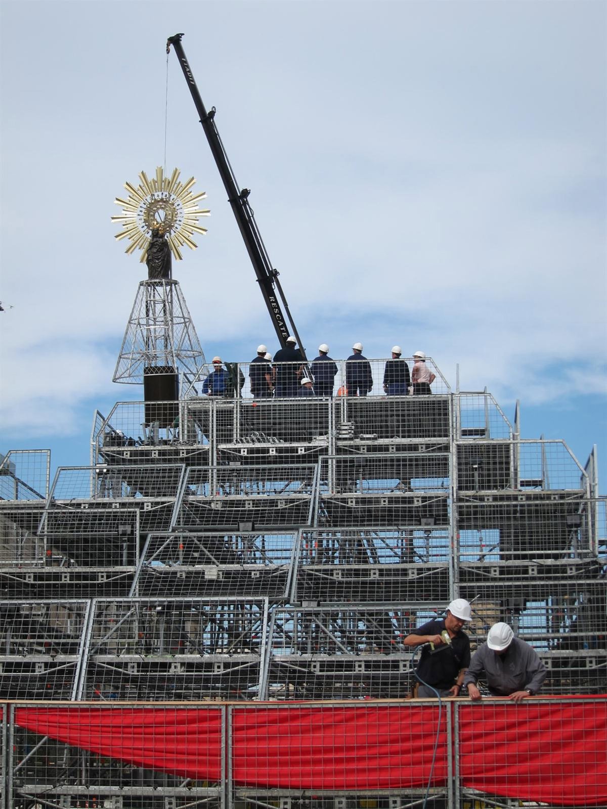 Operarios de las brigadas municipales, ayudados de una grúa, han colocado la imagen de poliester, de 1,5 metros, que descansa sobre un tronco piramidal de 2,5 metros, que este año se decorará con claveles rojos, y que corona la pirámide metálica de varios pisos en la que se depositarán los siete millones de flores de los oferentes.