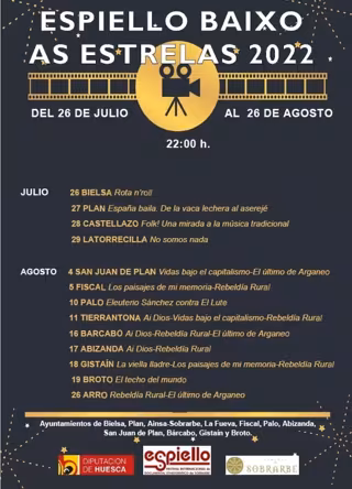Cartel de 'Espiello baixo as estrelas', la propueste que lelvará el cine al aire libre, desde el 26 de julio y hasta el 26 de agosto, a 13 localidades de la Comarca de Sobrarbe. - COMARCA DE SOBRARBE