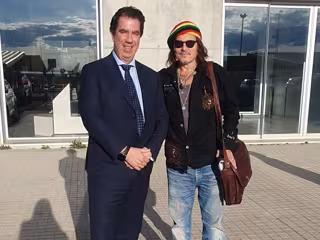 Archivo - El actor norteamericano Johnny Depp con el director del aeropuerto de Teruel, Alejandro Ibrahim, a pie de pista. - CORTES DE ARAGÓN. - Archivo