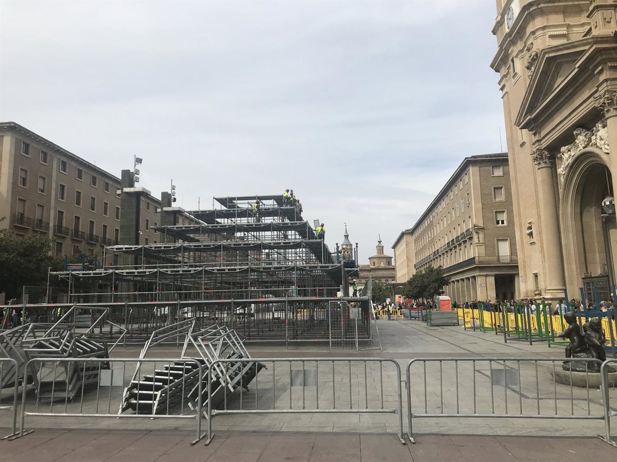 Los trabajos de montaje de la estructura de la Ofrenda de Flores a la virgen del Pilar de Zaragoza han comenzado este lunes y concluirán este martes, 11 de octubre, con la instalación de la parte superior de la imagen de la Virgen después de que se haya levantado la estructura piramidal.