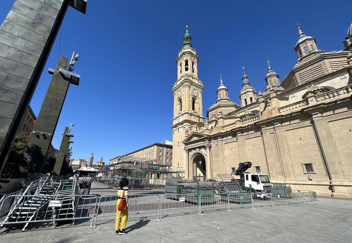 El montaje de la estructura piramidal de la Ofrenda de Flores a la Virgen del Pilar ha comenzado este jueves, 10 de octubre, y concluirá este viernes con la colocación de la réplica de la imagen para que el 12 de octubre se cubra con un colorido manto formado por los ramos de los miles de oferentes.