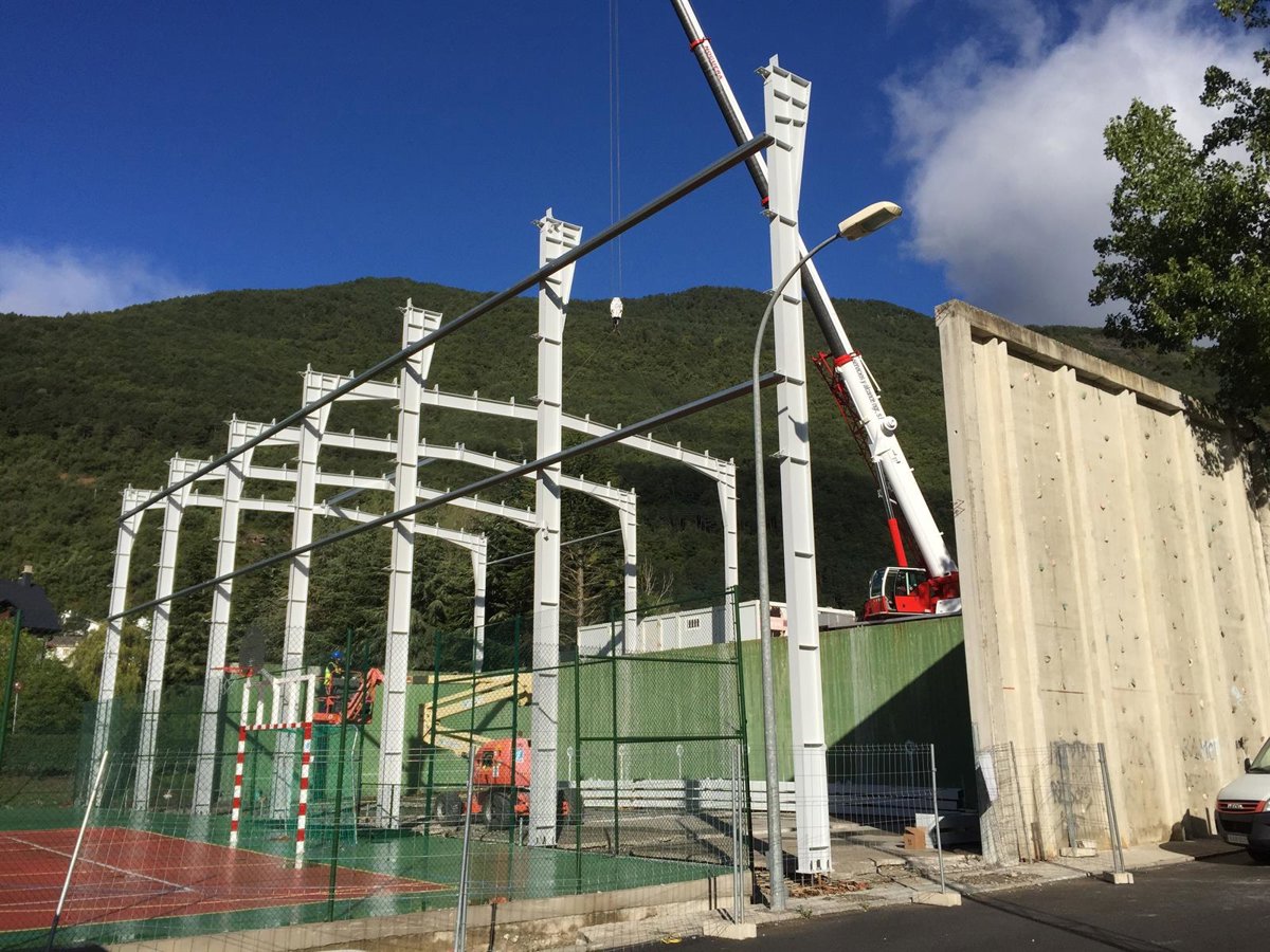 Las obras de mejora del nuevo recinto ferial de Biescas mediante el cerramiento del frontón avanzan a buen ritmo a un mes de la Feria de Otoño con el montaje de la estructura metálica que soportara la cubierta y cerramientos de este equipamiento municipal.