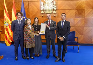 El delegado del Gobierno en Aragón, Fernando Beltrán, y el subsecretario del Ministerio de Educación, Antonio Roura, entregan la Cruz de Isabel la Católica a la familia del exsubsecretario Fernando Gurrea. - JAVIER BELVER