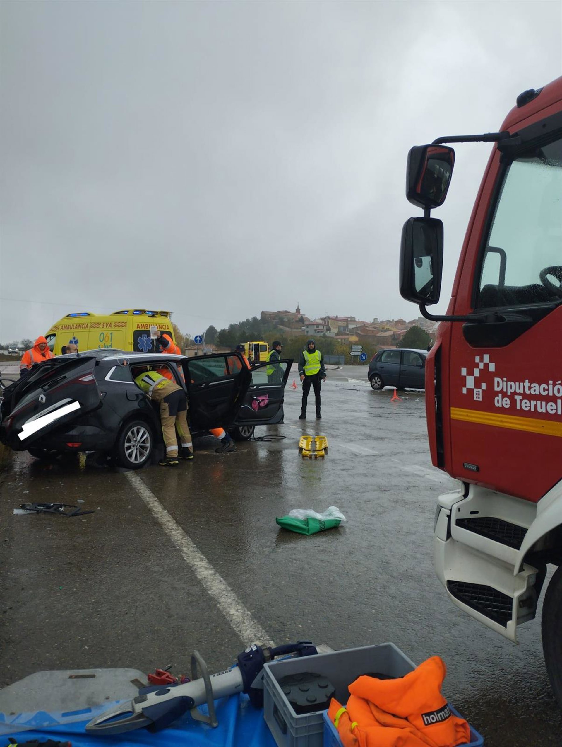 Bomberos de la Diputación de Teruel han excarcelado este sábado a dos personas que habían quedado atrapadas tras un choque entre dos vehículos en la A-222 a la altura de Cortes de Aragón.