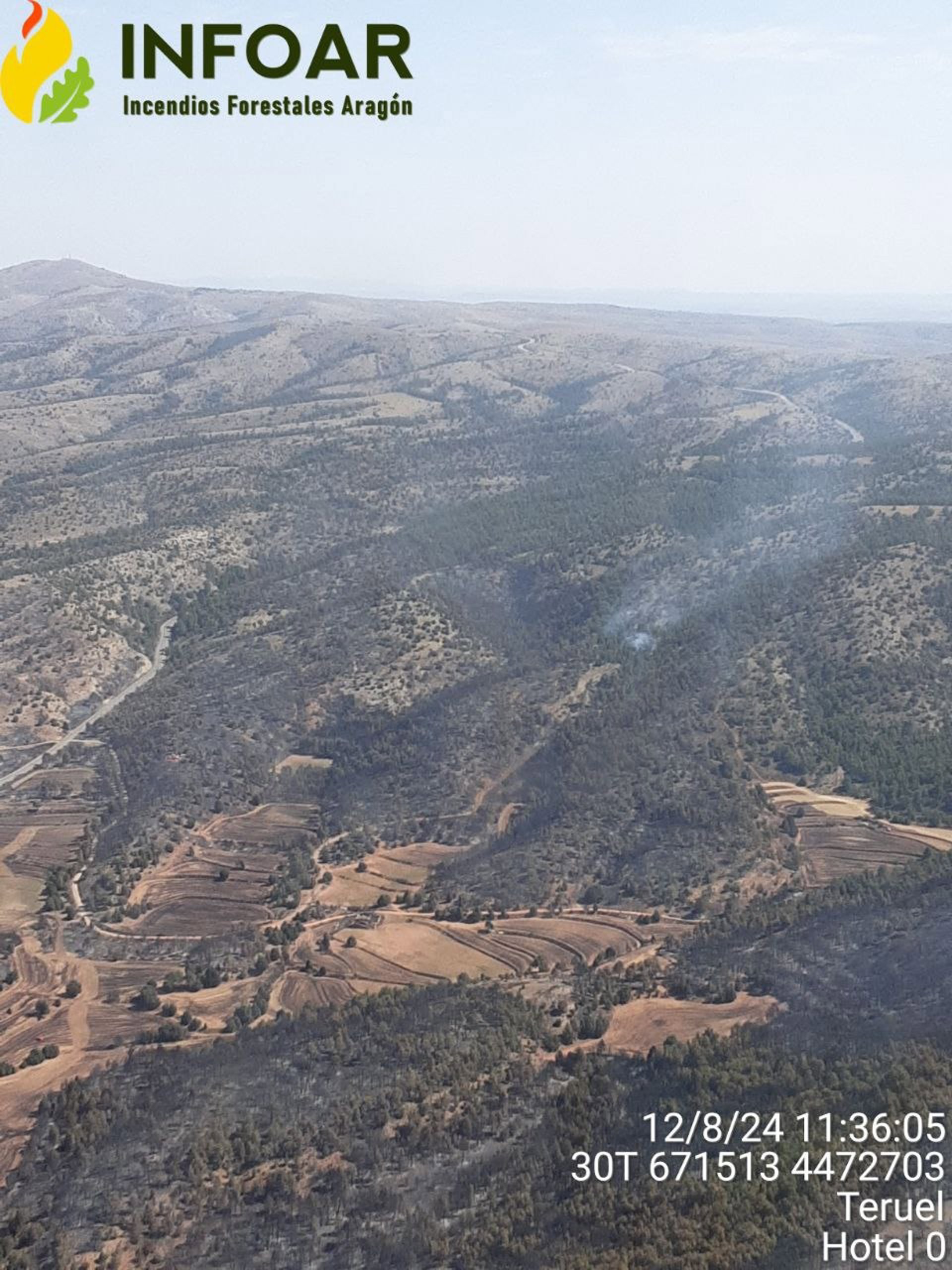 El Ejecutivo autonómico sigue con la Situación Operativa 2 Nivel 2 de la fase de emergencia del Plan Especial de Protección Civil de Emergencias por Incendios Forestales de Aragón (PROCINFO). Por parte del Operativo de Prevención y Extinción de Incendios (INFOAR) del Gobierno de Aragón, se han desplazado hasta el lugar del fuego 3 helicópteros con 3 brigadas helitransportadas (Teruel, Calamocha y Alcorisa) y el helicóptero de coordinación, 7 brigadas terrestres, 6 autobombas y 2 bulldozer. También se ha activado el vehículo pesado del Puesto de Mando Avanzado (PMA) con 3 técnicos GEDAX, 2 técnicos de la Unidad Técnica de Apoyo (UTA) y 2 Agentes para la Protección de la Naturaleza (APN).