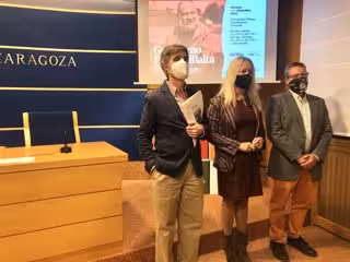 La diputada delegada de Cultura de la Diputación de Zaragoza, Ros Cihuelo, ha presentado la propuesta cultural, acompañada por el gerente del Consorcio Cultural Goya-Fuendetodos de la Diputación de Zaragoza, Ricardo Centellas; y el alcalde de Fuendetodos, Enrique Salueña.