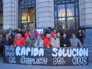 Un grupo de unos veinte vecinos de Zaragoza, en su mayoría personas mayores, se han concentrado en la plaza de España para reclamar una solución al conflicto del autobús y han portado una gran pancarta en la que se podía leer 'Por una rápida solución al conflicto del bus'.