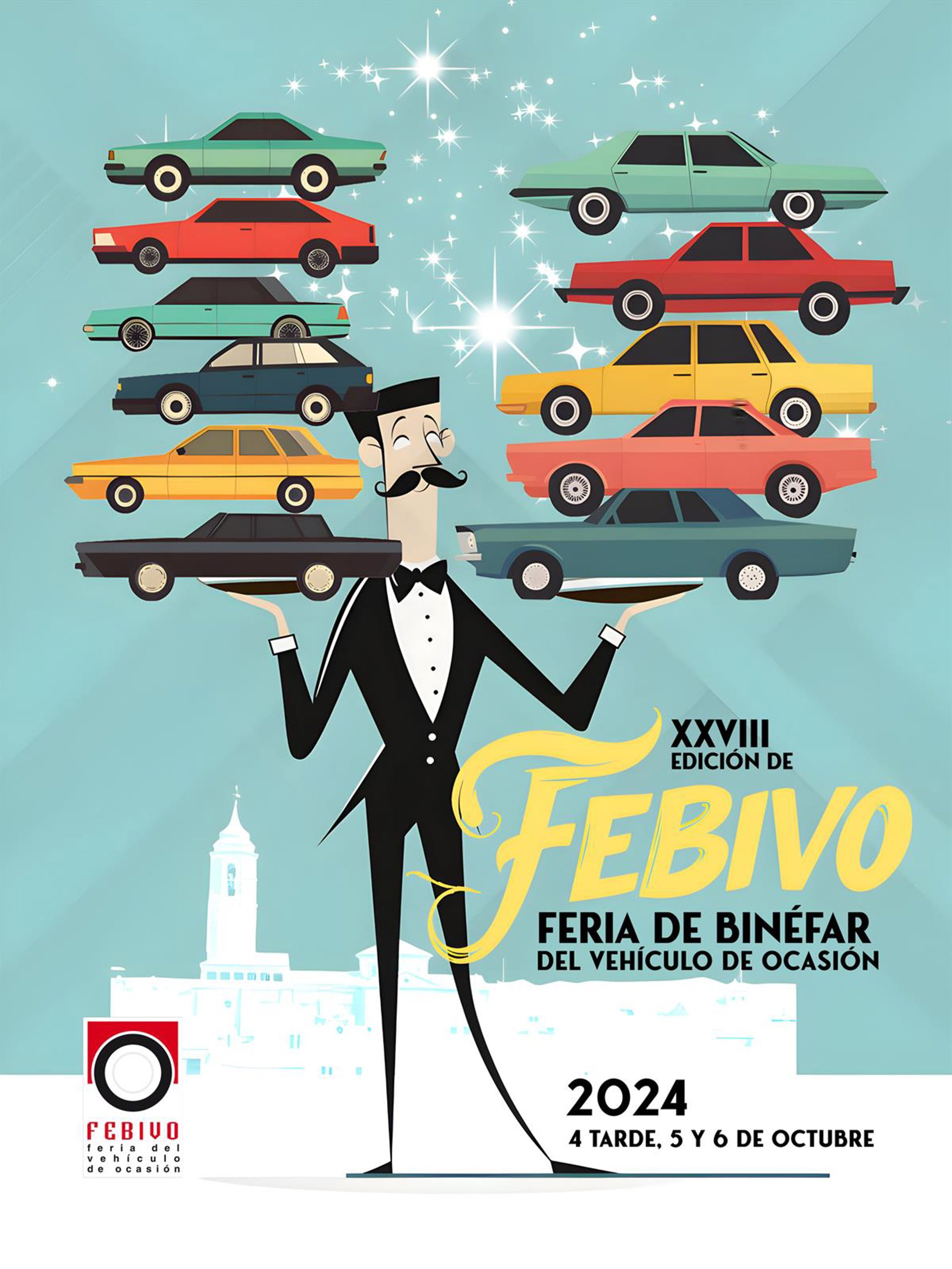 El personaje principal es un camarero con muy buena presencia que sujeta en ambas manos bandejas sobre las que descansan un gran número de vehículos de ocasión. "El mensaje quiere transmitir que en FEBIVO te sirven en bandeja una multitud de coches de los que podrás elegir el que más te guste", según explicó el propio autor.