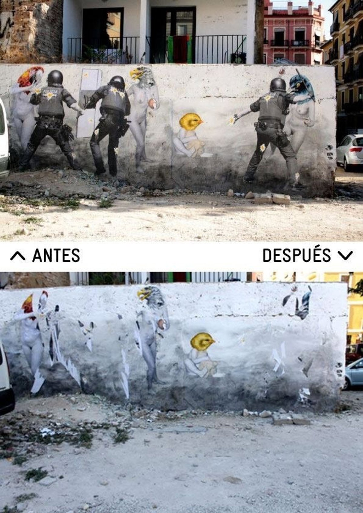 Sin embargo, apuntan desde el encuentro artístico, "la mutilación de la obra 'Don't be afraid/No tengas miedo' ha tenido lugar en la figuras de los policías, dejando los desnudos prácticamente intactos".