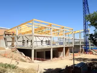 Las obras de construcción de la piscina cubierta de Alagón han culminado esta semana una de sus fases más significativas, finalizando los trabajos de estructura de hormigón y de estructura de madera laminada en cubierta.