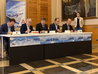 El vicepresidente del Gobierno de Aragón y consejero de Industria, Arturo Aliaga, el presidente de la DPH, Miguel Gracia; el presidente de la Mancomunidad del Alto Valle del Aragón, Álvaro Salesa; el consejero delegado de Explotaciones Turísticas de Candanchú, Fernando Montón; y el director general de la Estación Invernal del Valle de Astún, Jesús Santacruz, han suscrito este miércoles el convenio para impulsar el proyecto de la unión de las estaciones de esquí de Astún y Candanchú, en el Pirineo oscense. Aliaga Ha expresado su deseo de aprobar el Plan de Interés General (PIGA) este mes de abril.