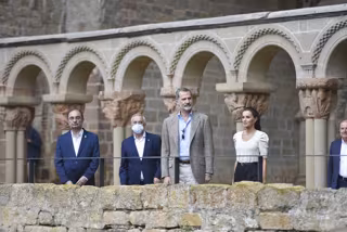 Don Felipe y Doña Letizia han llegado al monasterio, donde han sido recibidos por el presidente de la Comunidad Autónoma de Aragón, Javier Lambán, quien les ha acompañado al interior del cenobio, junto con el guía del mismo. Este monasterio, cuna del Reino de Aragón, fue declarado en 1889 Monumento Nacional, y en 1920, dicha protección fue completada con la declaración de Sitio Nacional.