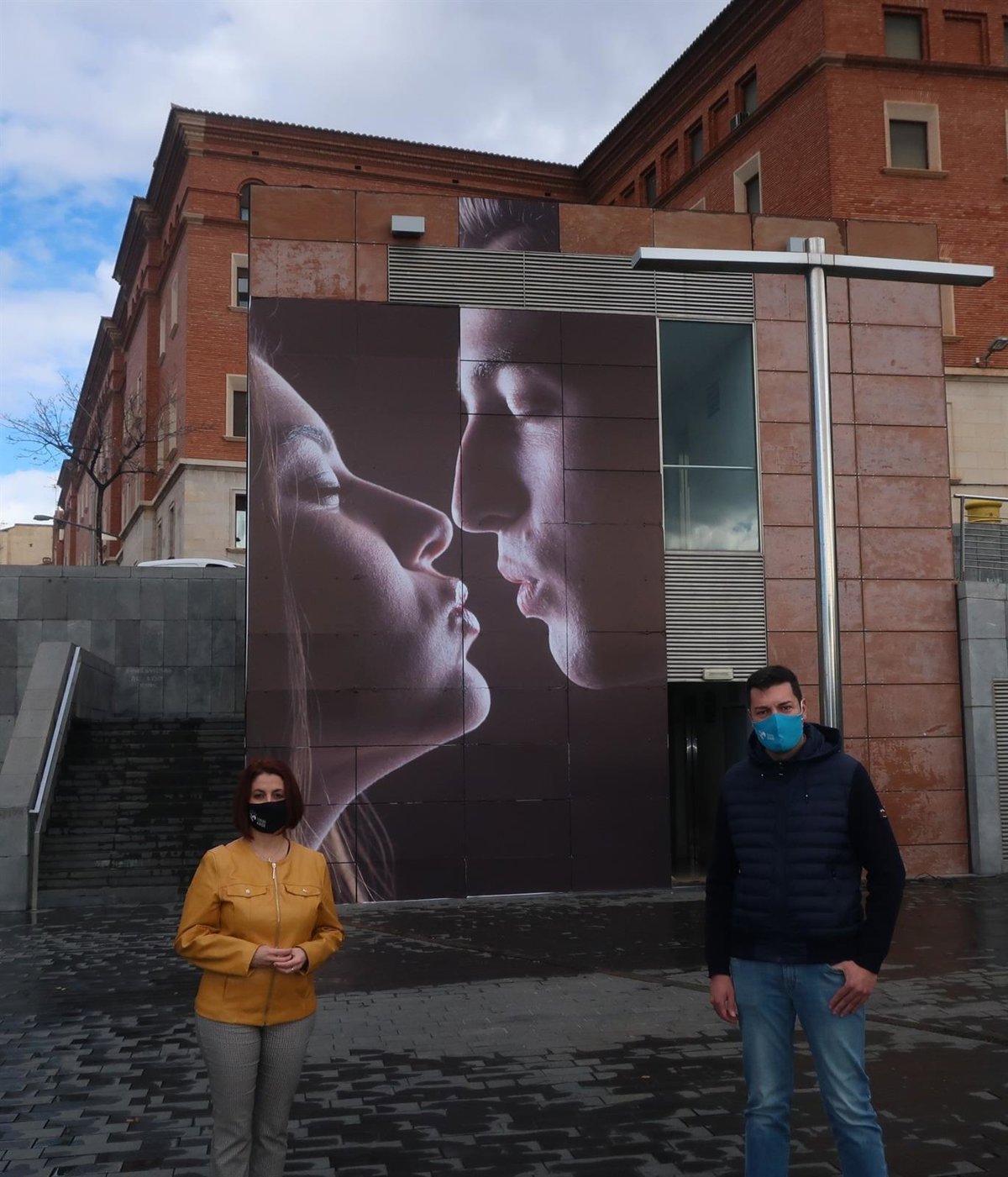 Una imagen de una pareja a punto de besarse preside la Glorieta de Teruel, coincidiendo con la celebración, este domingo, de la festividad de San Valentín, ha informado el Ayuntamiento en una nota de prensa.