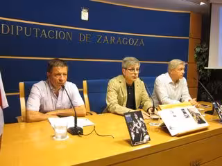 El coordinador del área de Cultura de la Diputación Provincial de Zaragoza (DPZ), Juan José Borque, el alcalde de Fuendetodos, Enrique Salueña, y el comisario de la exposición, Javier Lacruz, han presentado en rueda de prensa esta muestra que se podrá visitar hasta el 16 de octubre.