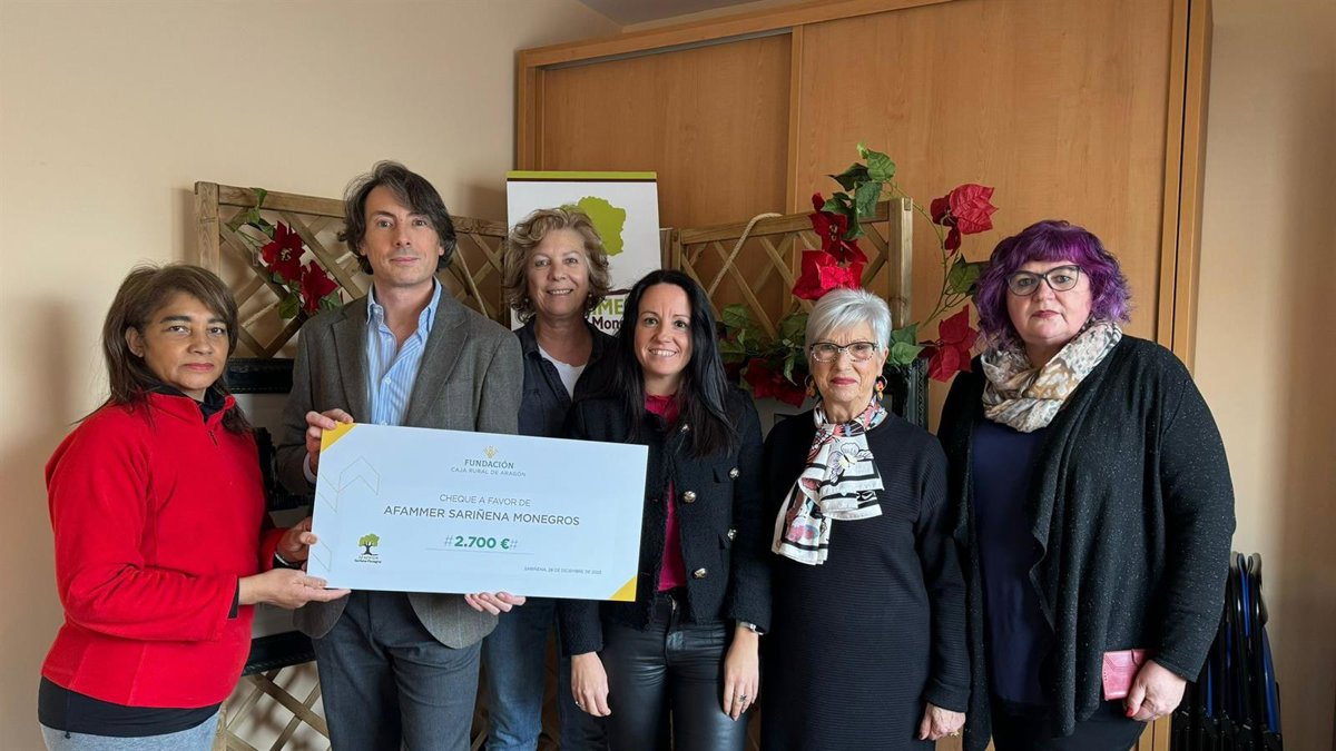 La Fundación Caja Rural de Aragón ha entregado un cheque de 2.700 euros a la asociación Afammer Sariñena-Monegros para equipar el taller de costura Hilando Oportunidades donde se formarán mujeres
