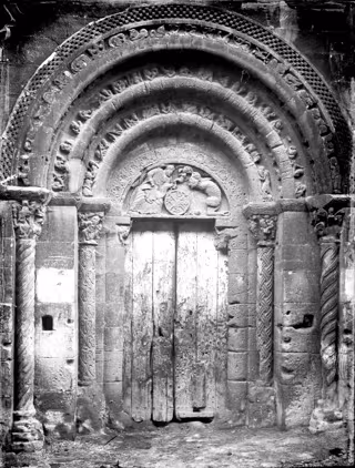 La portada tiene cinco metros de altura por cuatro de anchura. Representa en su tímpano a San Miguel disputándose un alma con un demonio y en las tres arquivoltas hay más de sesenta figuras de guerreros, saltimbanquis, músicos y animales, que reflejan la complejidad de la sociedad medieval.