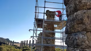 La excavación arqueológica previa ha permitido descubrir el sistema de asentamiento del pilar sobre el terreno y marcas de afianzamiento de las grúas o andamios con las que fueron elevados los sillares.
