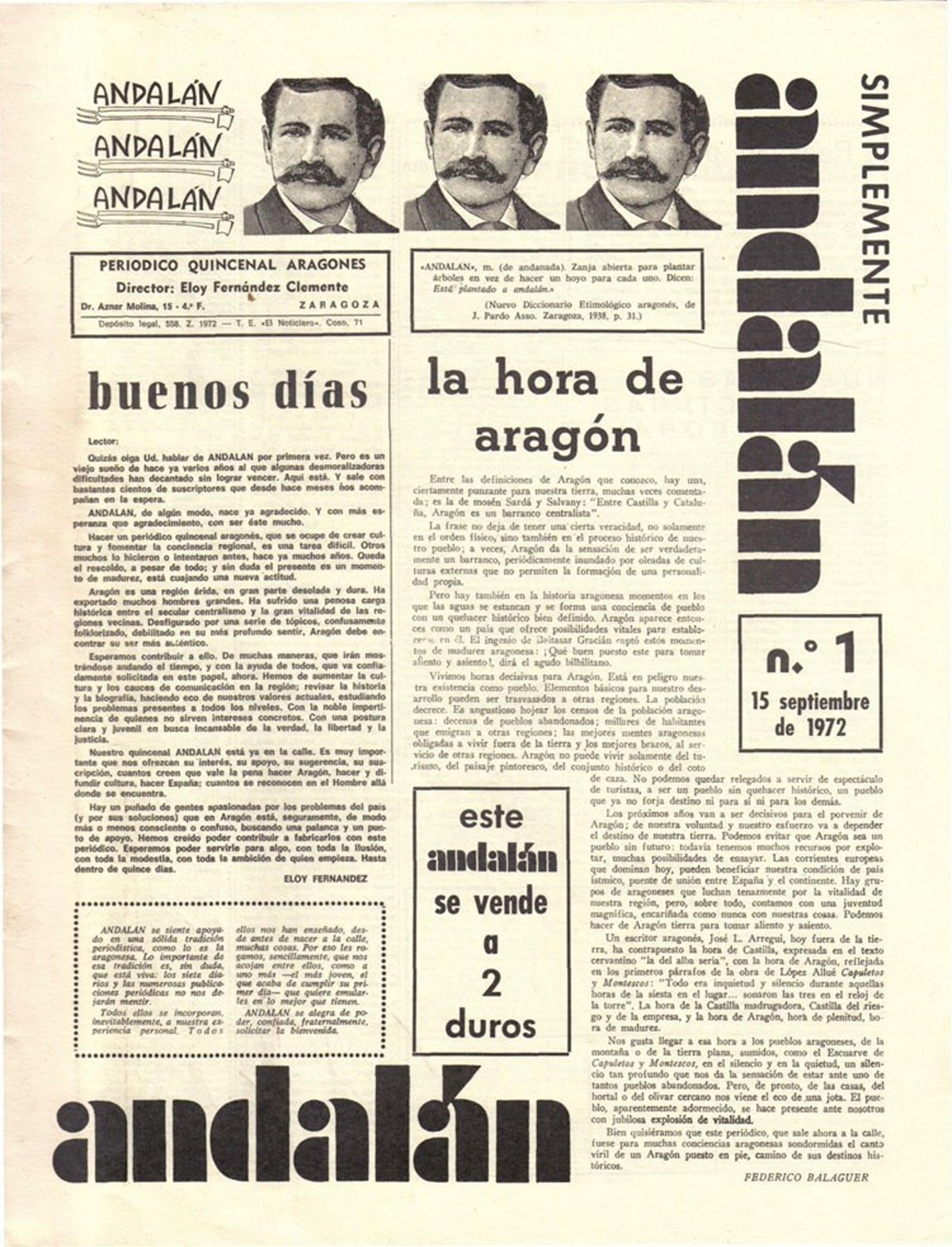 Número 1 del periódico Andalán, cuyos fundadores son distinguidos por el Gobierno autonómico con el Premio Aragón 2022. - GOBIERNO DE ARAGÓN