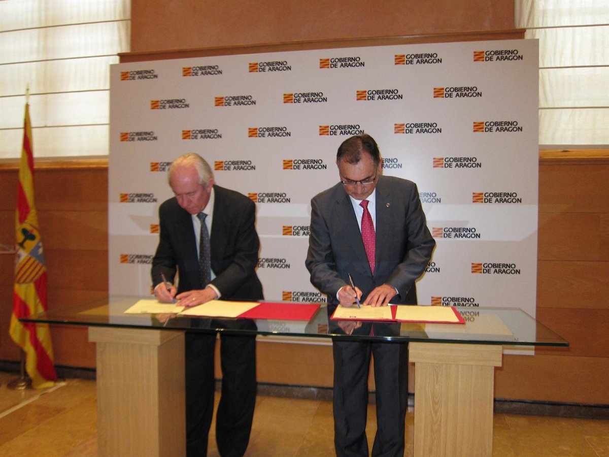 El consejero de Economía y Empleo del Gobierno de Aragón, Francisco Bono, y el director general de General Motors España, Antonio Cobo, han firmado este martes un convenio por el que la multinacional participará en el programa Arex Network de Empresas Tractoras en la Comunidad, cuyo objetivo es facilitar y mejorar la internacionalización de las compañías aragonesas.