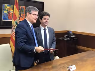 El consejero de Presidencia del Ejecutivo regional, Vicente Guillén, y el alcalde de Huesca, Luis Felipe, han firmado este miércoles, en el despacho del consejero, el convenio que regula esta aportación.