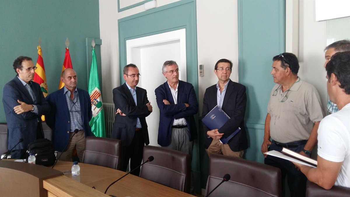 Olona ha estado acompañado por los directores generales de Producción Agraria y de Desarrollo Rural, José María Salamero y Jesús Nogués, respectivamente, así como por el director de Agroseguro en Aragón, Juan Cruzán, quienes se han reunido este jueves en Fraga con el alcalde, Luis Miguel Lapeña, productores y los fruticultores de la zona.