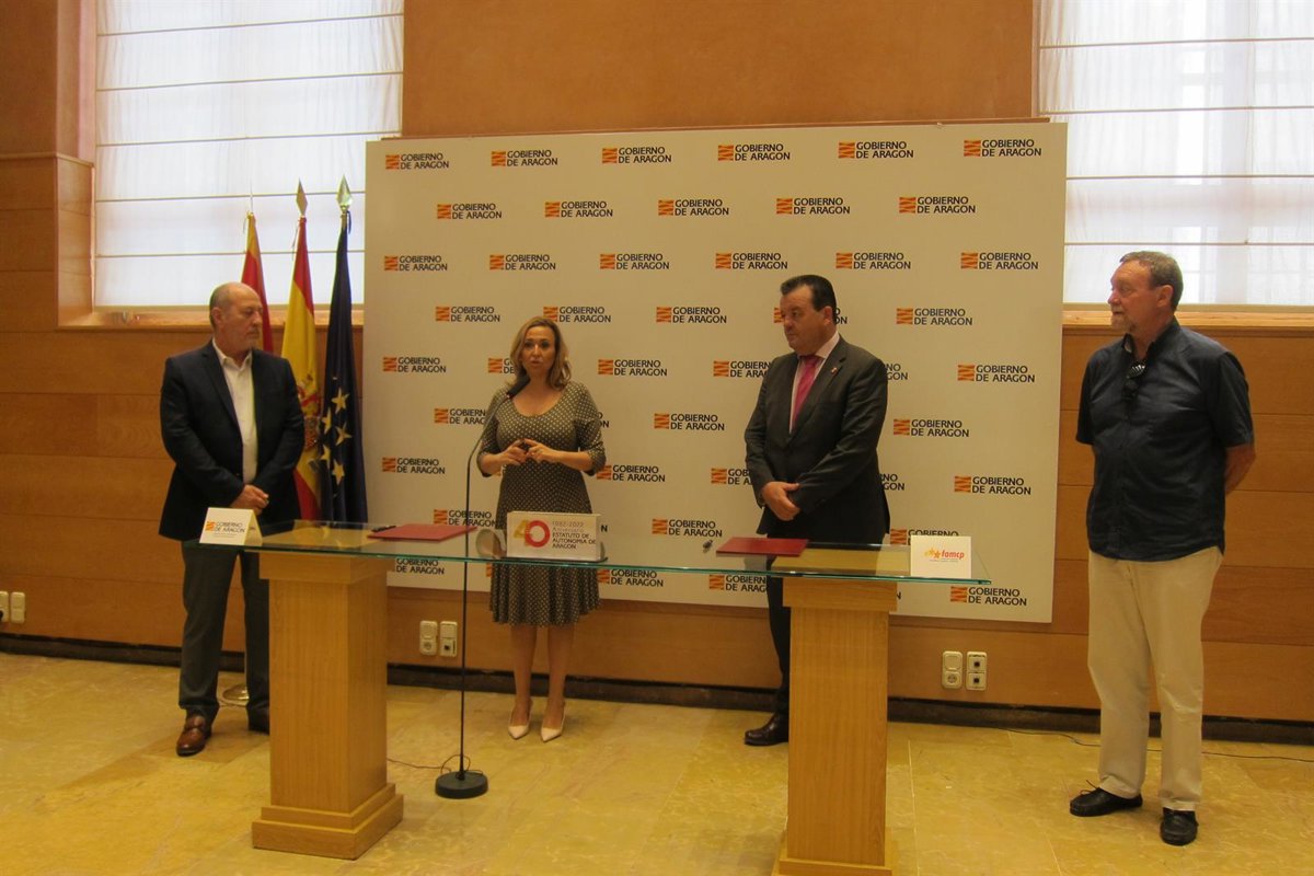 La consejera de Presidencia y Relaciones Institucionales del Gobierno de Aragón, Mayte Pérez, y el presidente de la Federación Aragonesa de Municipios, Comarcas y Provincias, Luis Zubieta, en el acto de firma de dos convenios de colaboración. - EUROPA PRESS