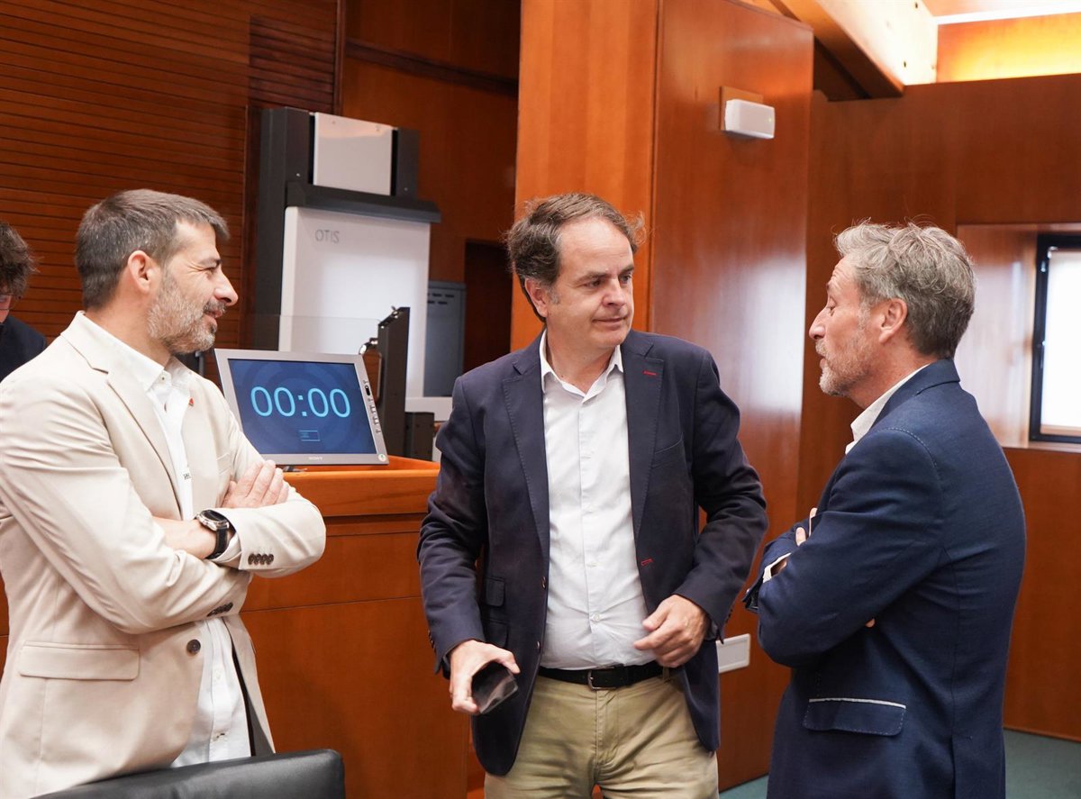 El consejero de Hacienda, Interior y Administración Pública del Gobierno de Aragón, Roberto Bermúdez de Castro, conversa con los diputados José Luis Soro (CHA) y Álvaro Sanz (IU). - CORTES DE ARAGÓN.