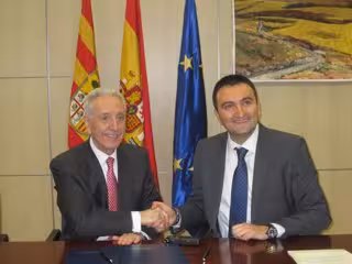 El consejero de Agricultura, Ganadería y Medio Ambiente del Gobierno de Aragón, Modesto Lobón, y el director de Instituciones de 'la Caixa' en Aragón, Ricardo Ger, han renovado este lunes el convenio de colaboración para cooperar en la protección, conservación y mejora del medio natural de los espacios naturales protegidos de Aragón.