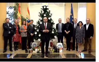 En torno a un gran árbol decorado con la marca de Aragón Alimentos, el Presidente de Aragón, Javier Lambán, anima a todos los aragoneses a disfrutar de la Navidad y a consumir productos aragoneses, "que son los más universales de todos". Además, invita a disfrutar de "reencuentros felices", "recuerdos emocionados" y "tertulias animadas" con familiares y amigos en estas fechas señaladas.