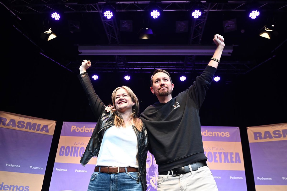 La candidata de Podemos-Alianza Verde a la Presidencia del Gobierno de Aragón, María Goikoechea, y el exvicepresidente del Gobierno, Pablo Iglesias, durante un mitin celebrado en Zaragoza. - Ramón Comet - Europa Press