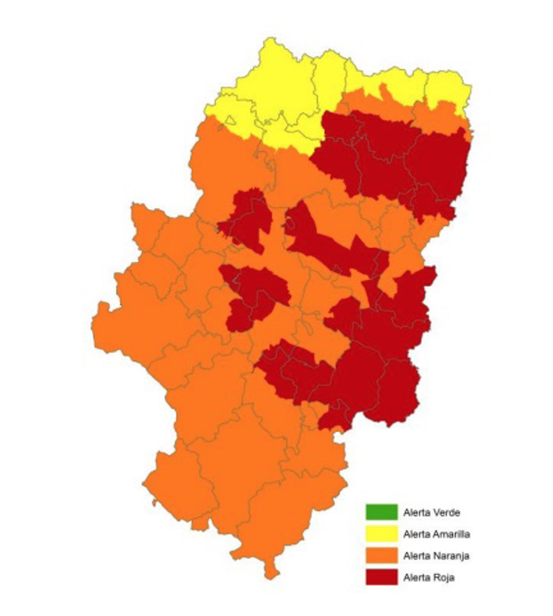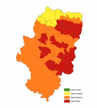 La alerta roja afecta a las zonas de Bajo Ebro Forestal y Muela de Alcubierre, Valmadrid y Zuera, Prepirineo Central, Prepirineo Oriental, Puertos de Beceite, Somontano Oriental y Somontano Sur. El resto de la Comunidad se encuentra bajo alerta naranja, excepto el extremo norte que está en amarilla.