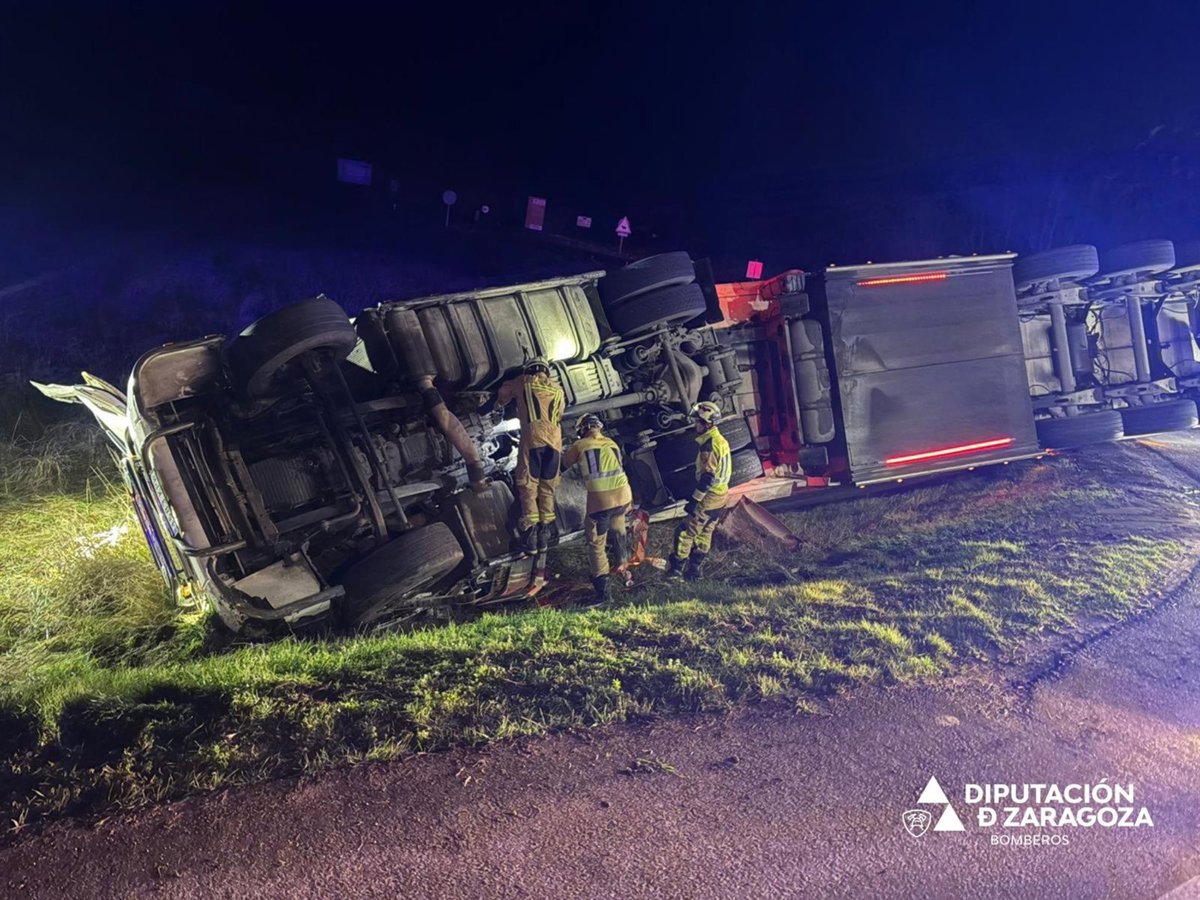 Los bomberos de la Diputación de Zaragoza han excarcelado al único ocupante de un camión que se ha salido de la vía y ha volcado a la salida del polígono Valdeferrín de Ejea de los Caballeros (Zaragoza), según han informado desde la Diputación Provincial de Zaragoza.