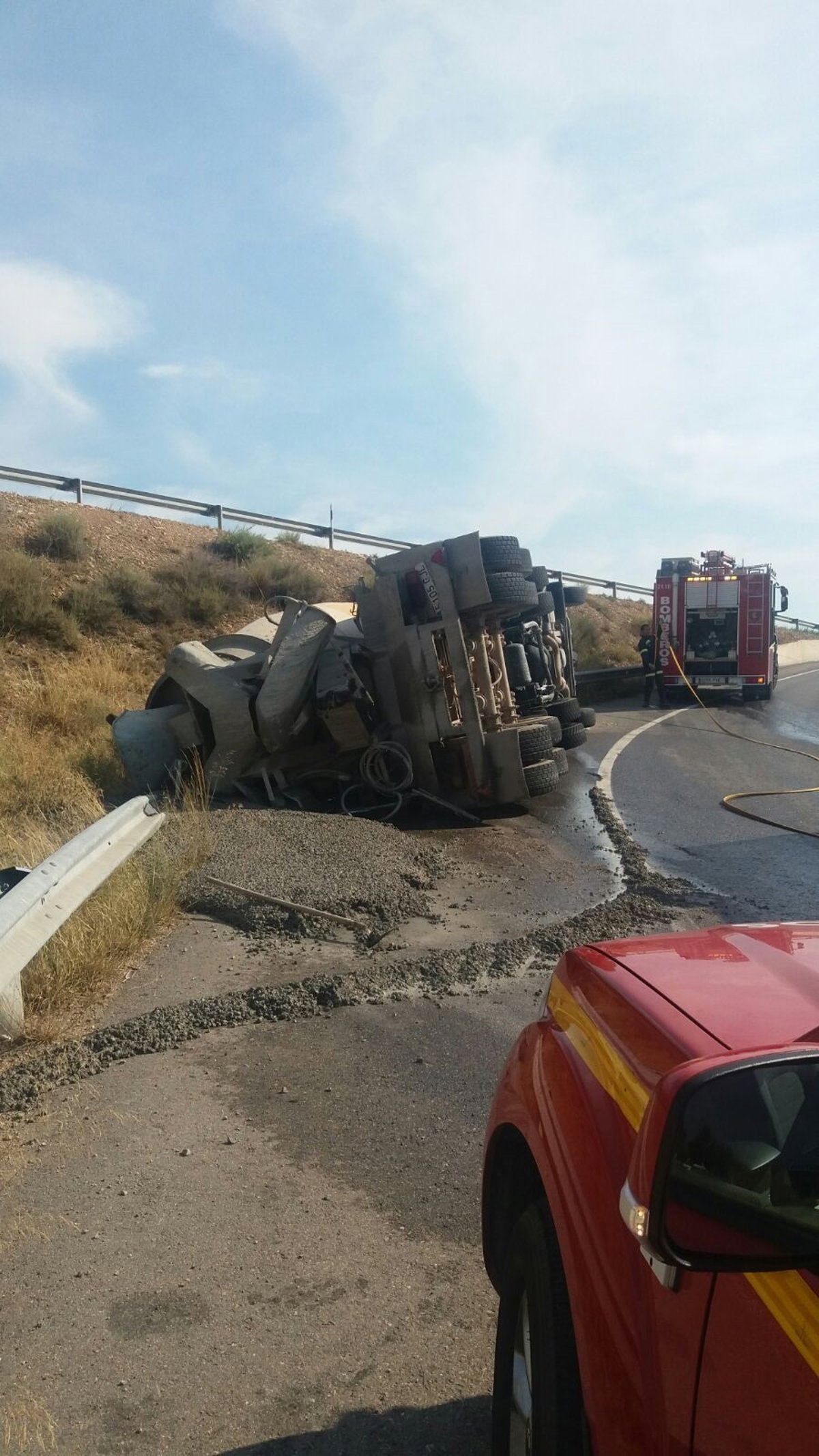 Una persona ha resultado herida este miércoles al volcar el camión hormigonera que conducía en el acceso a la A-2 desde la localidad zaragozana de La Almunia.