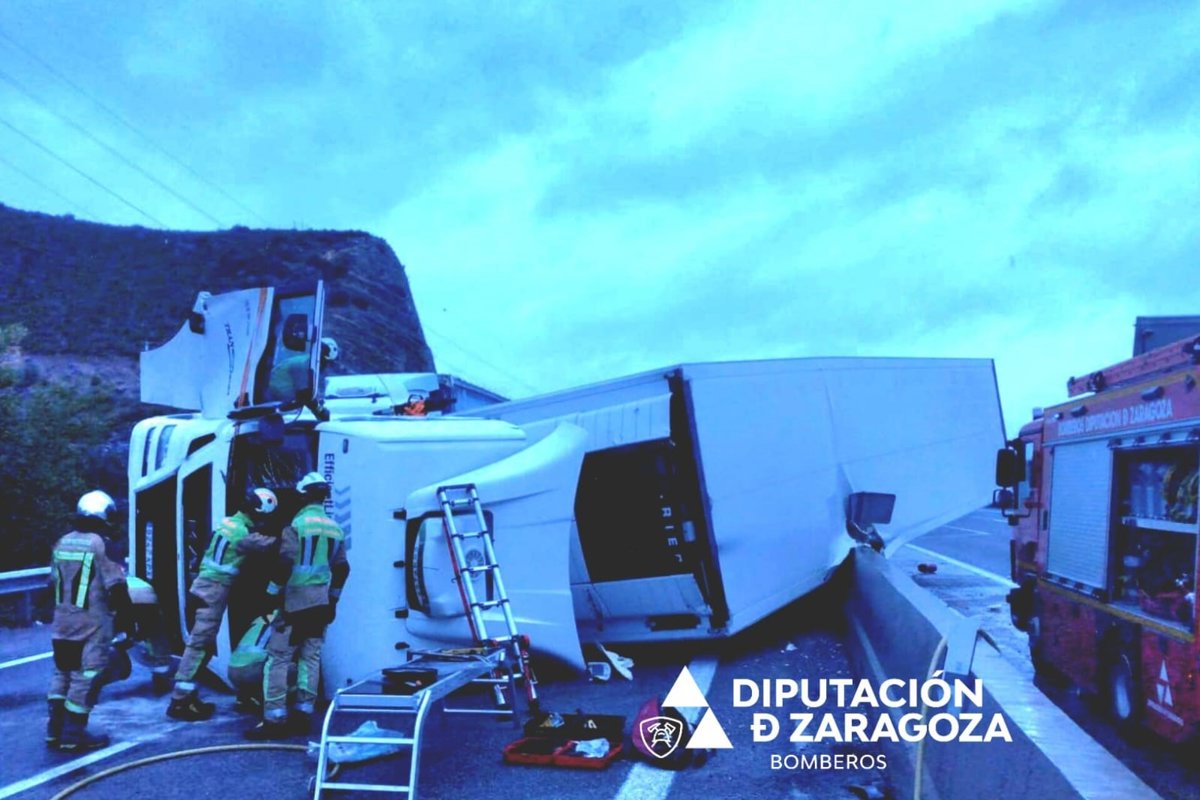 El tráiler circulaba en sentido Zaragoza y ha volcado sobre un lateral, quedando cruzado sobre la calzada. El conductor, atrapado en la cabina, ha sido rescatado por los bomberos de los parques de Calatayud y La Almunia de Doña Godina de la DPZ.