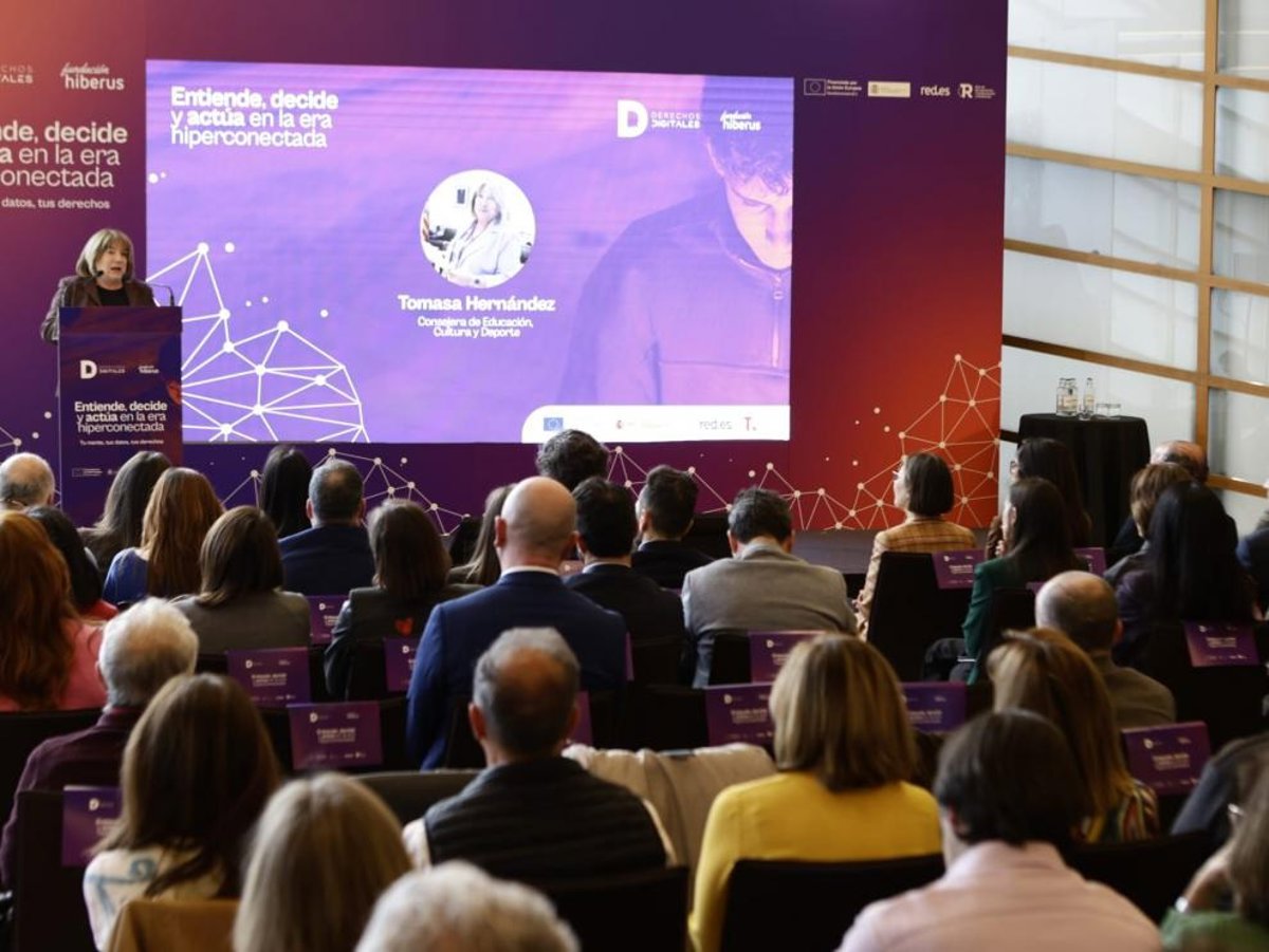 La consejera de Educación, Cultura y Deporte en funciones, Tomasa Hernández, ha clausurado este lunes la jornada 'Entiende, decide y actúa en la era hiperconectada. Tu mente, tus datos, tus derechos', celebrada en el Hotel Reina Petronila y organizada por Fundación hiberus, donde ha apelado a la responsabilidad colectiva para garantizar que los menores tengan criterio, protección y herramientas en el mundo digital".
