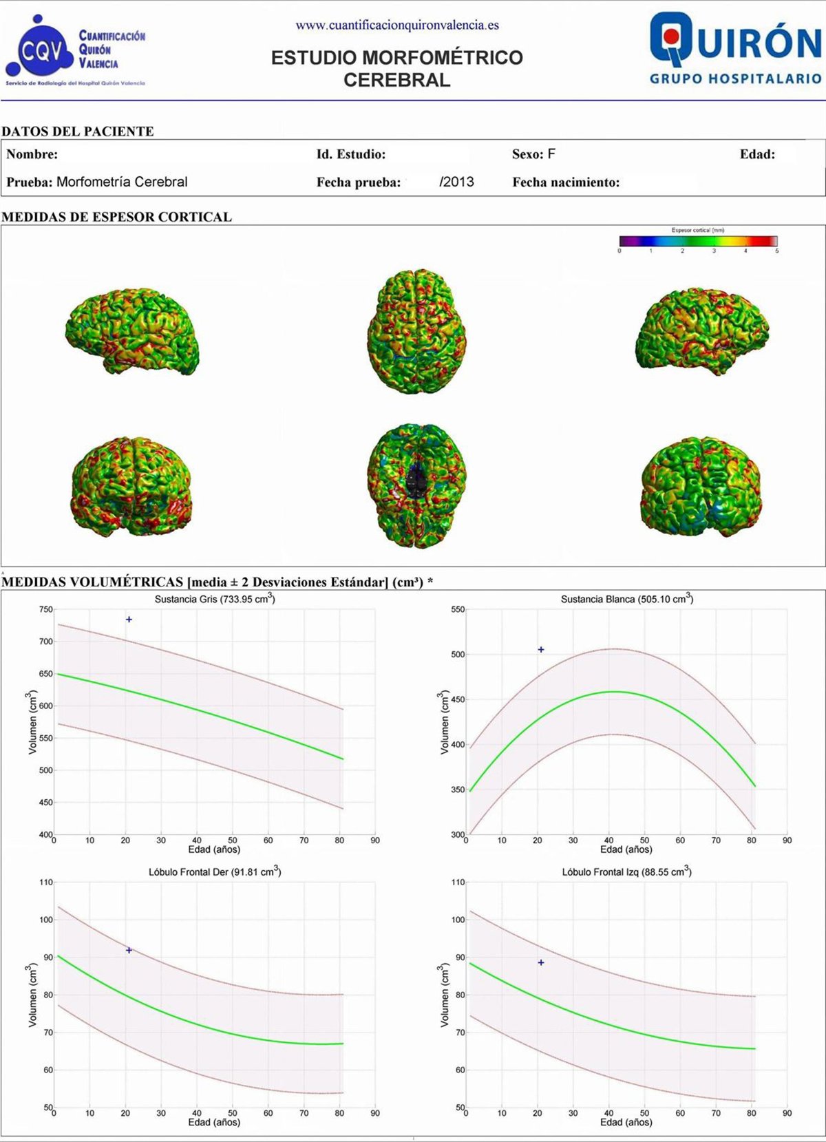 El primer paso para poder obtener resultados es la resonancia magnética con imágenes del cerebro en 3D. Una vez se obtienen estas imágenes tridimensionales, se envían al departamento de Cuantificación Quirón Valencia, donde se comparan con una base de datos de pacientes controles sanos (de 0 a 80 años), lo que permite la obtención de las diferencias entre el paciente y el grupo de muestra.
