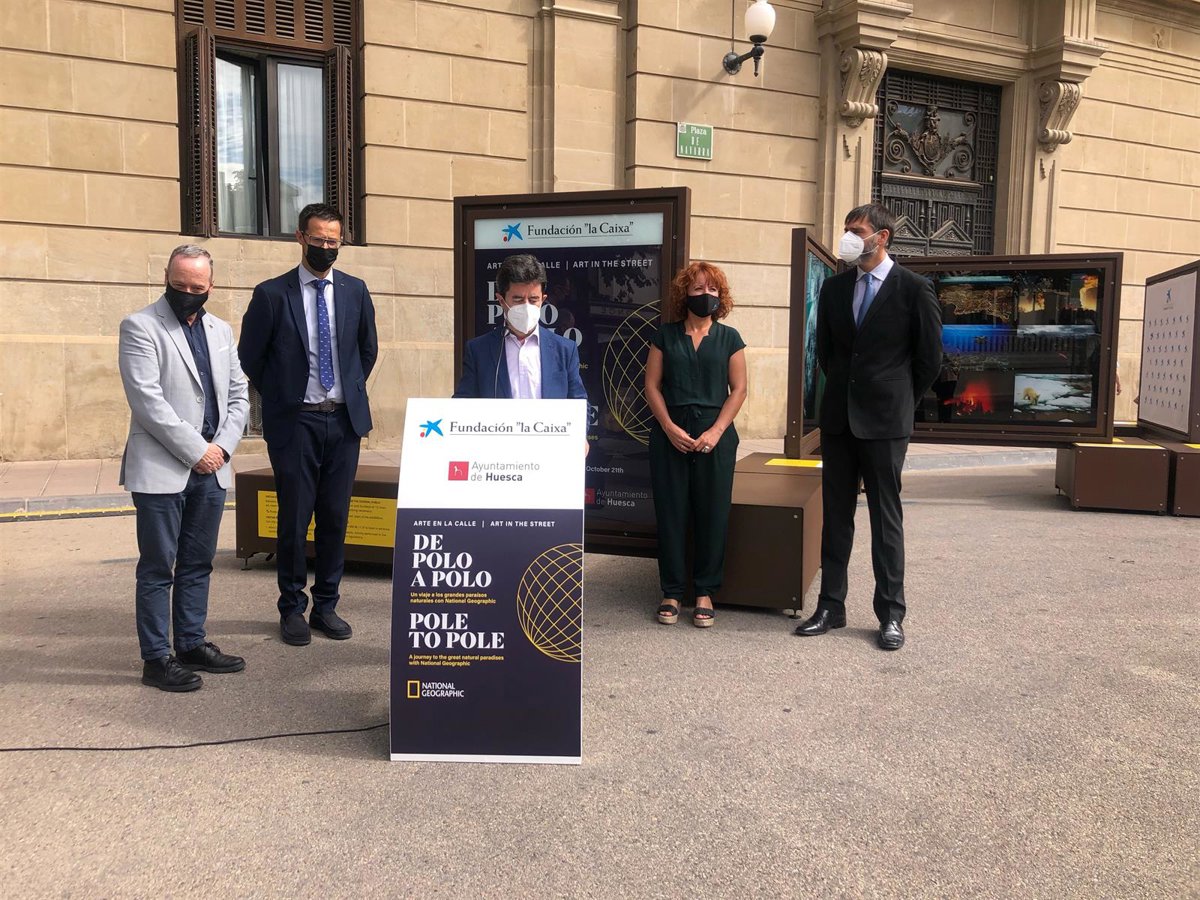 El alcalde de Huesca, Luis Felipe; el director de la oficina Store de CaixaBank en Huesca, Ramón Román; y la delegada de la Fundación 'la Caixa' en Aragón y La Rioja, Alejandra Usón, acompañados por el comisario de la muestra, Francisco Javier Gómez, han inaugurado este jueves 'De Polo a Polo, un viaje a los grandes paraísos naturales', que se puede ver en la plaza de Navarra hasta el 21 de octubre.