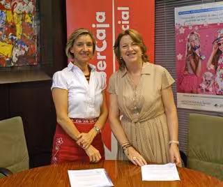 La directora de la Obra Social de Ibercaja, Teresa Fernández, y María Pilar de la Vega, y la presidenta de UNICEF-Comité Aragón, María Pilar de la Vega, han firmado un convenio para apoyar el programa 'La comunidad educativa que aprende'.