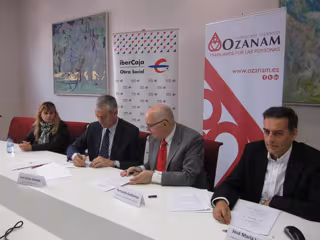 El jefe de la Obra Social de Ibercaja, Juan Carlos Sánchez, y el presidente de la Fundación Federico Ozanam, Fernando Galdámez, han suscrito este acuerdo de colaboración y han realizado un balance del programa que ha permitido a 2.187 personas disponer de una vivienda digna. En el acto han participado también el subdirector de la Fundación Ozanam, José María Lamana, y una de las inquilinas que se ha beneficiado de este proyecto, María Jesús Domínguez.