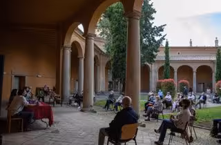 La presentación del libro 'Francisco de Artiga: el final de un mundo' este jueves ha contado con aforo limitado en el patio del Museo de Huesca para respetar las medidas preventivas necesarias ante la situación sanitaria del coronavirus.